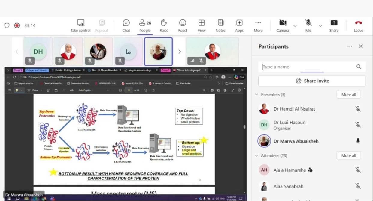 في إطار السعي المستمر لتطوير الكفاءات العلمية، نظمت كليتا الدراسات العليا والصيدلة في جامعة عمان الاهلية ورشة عمل علمية متخصصة بعنوان: ‏"Proteomic Technologies: Sequencing and Mass Spectrometry for biological system investigation" وقدمت الورشة الدكتورة مروة أبو عيشة عبر "منصة التميز"، مستهدفةً بشكل أساسي تعزيز قدرات طلبة الدراسات العليا في تخصص العلوم الصيدلانية وتزويدهم بالأدوات الحديثة اللازمة للتميز البحثي. وتأتي هذه الورشة استكمالاً لسلسلة من ورش العمل المتخصصة التي تم تنظيمها لتشمل العديد من تخصصات الماجستير في الجامعة، وذلك ضمن رؤية مؤسسية تهدف إلى تمكين الباحثين في مختلف الحقول العلمية. وقد تناولت الورشة شرحاً معمقاً لأحدث تقنيات قياس الطيف الكتلي (Mass Spectrometry) وتسلسل البروتينات، مع التركيز على كيفية توظيف هذه التقنيات المتقدمة في استقصاء الأنظمة البيولوجية. وتهدف هذه المبادرة إلى تمكين طلبة الماجستير من تطبيق أدوات التحليل الدقيق في أبحاثهم الصيدلانية، مما يساهم في رفع سوية المخرجات العلمية ورفد القطاع الصيدلاني بكوادر مؤهلة تمتلك مهارات تقنية متقدمة.